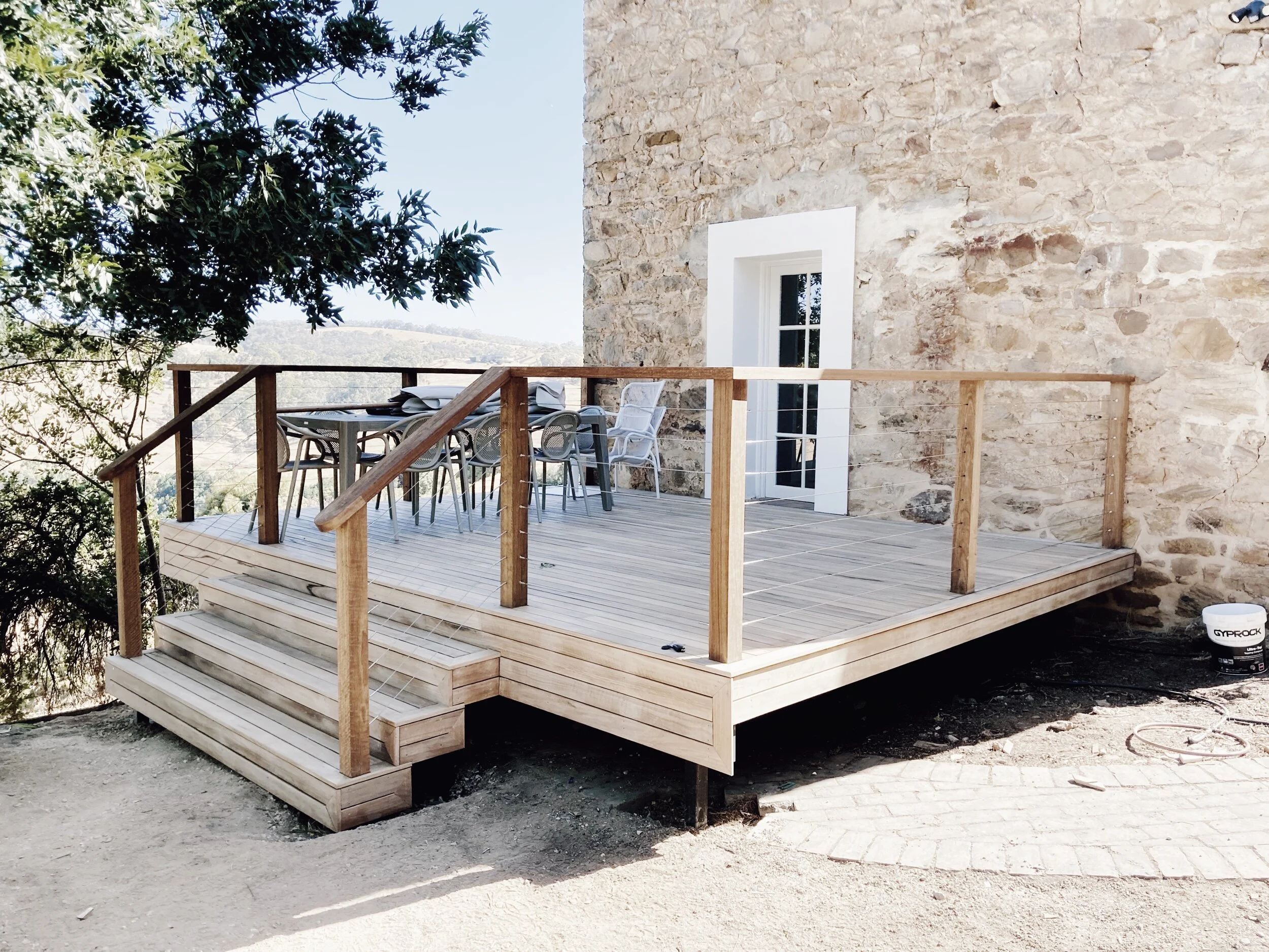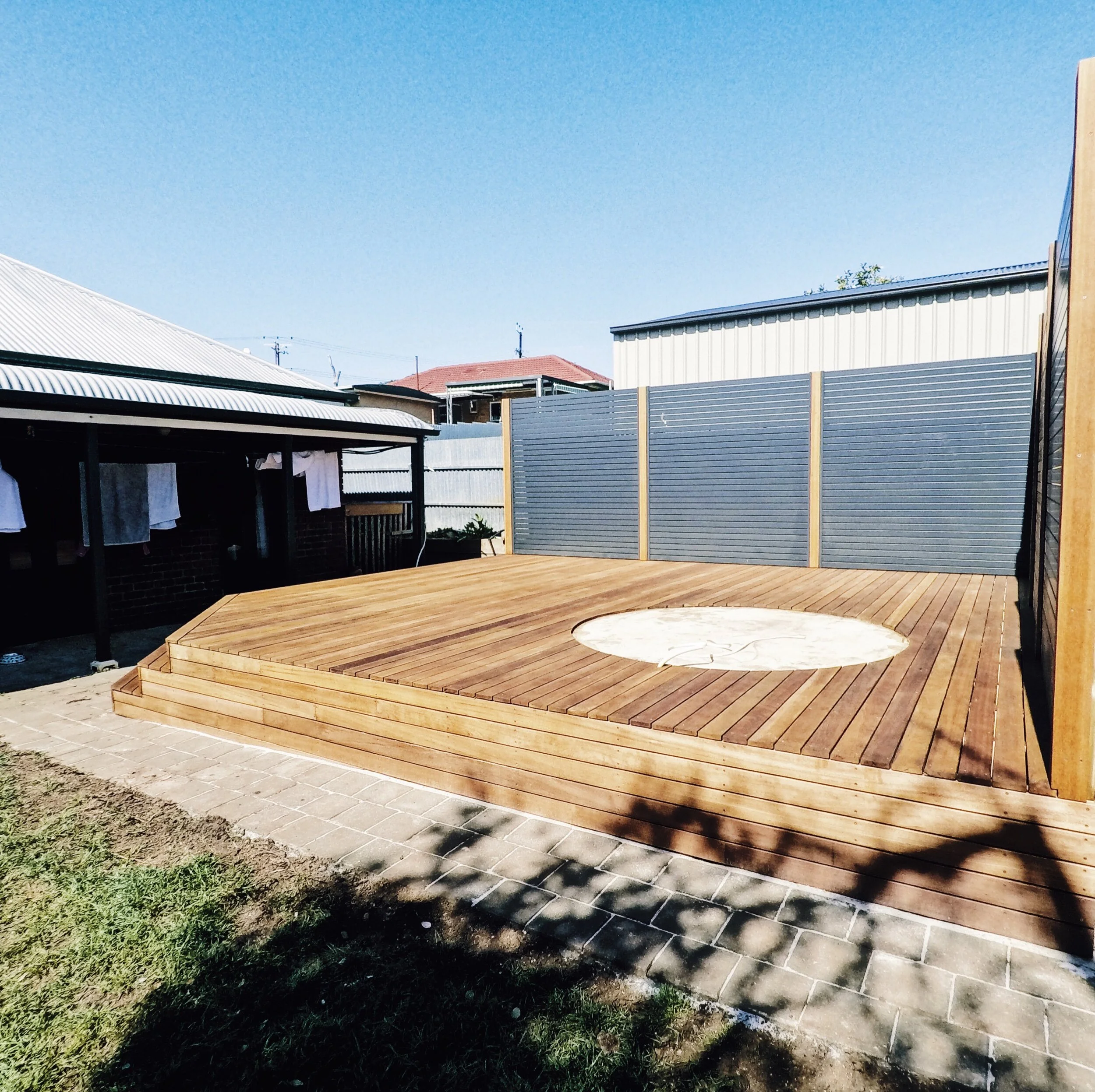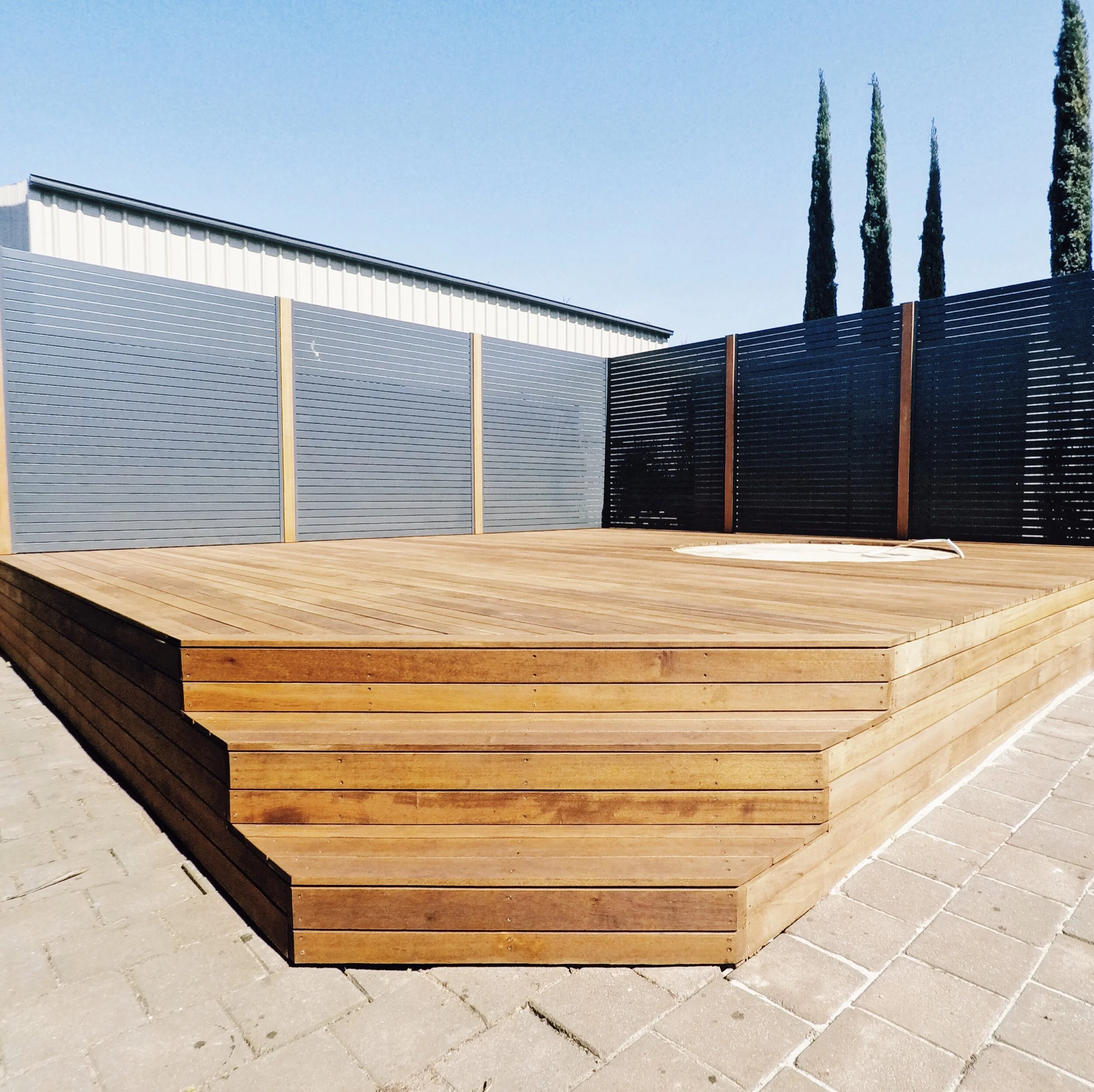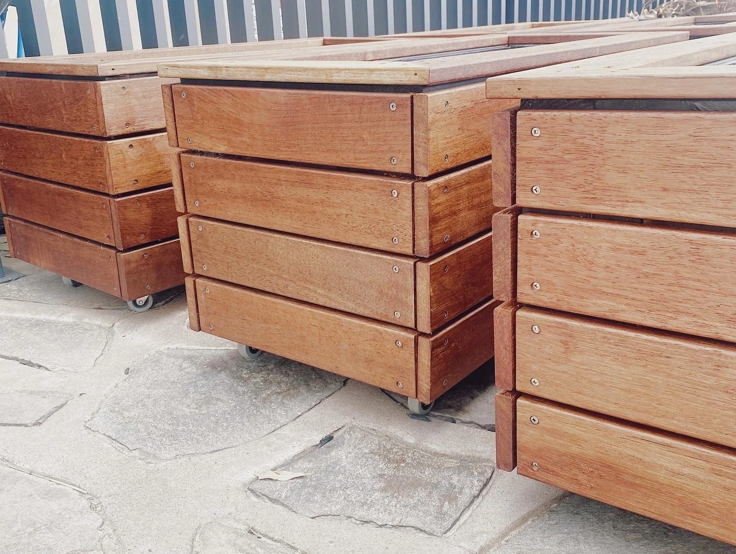 Integrated stairs into a sloping garden bed. Hardwood planter boxes.